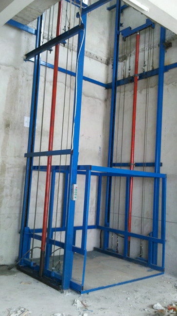 液压式升降货梯是在两层之间运输货物的一种设备,主要由两列立柱,台面和液压驱动部件等部分组成。载重可以从200kg到2000kg,台面可以做到3米×2米,高度可以做到6米,上升速度为3.5米/分钟。升降平台的上升和下降是通过安装在导轨里面的液压油缸来实现的。液压油缸是通过安装在地面旁边的液压泵站提供动力来驱动的。一般标准的电源为三相380V,单相为220V也可。控制电压为24V。在每一层都安装有控制盒及急停按钮。超行程开关安装在顶部,防止设备超过设定高度运行。防爆阀在油缸底部,防止油管爆裂,平台突然下降。如果载重超过额定载重的120%,平台将不会起升。每一层都安装有和设备互锁的门,只有当平台在那一层,那层的门才能开启,否则门是打不开的。如果有一扇门没有关好,设备是不会动作的。这样可以保障人员货物的安全。
